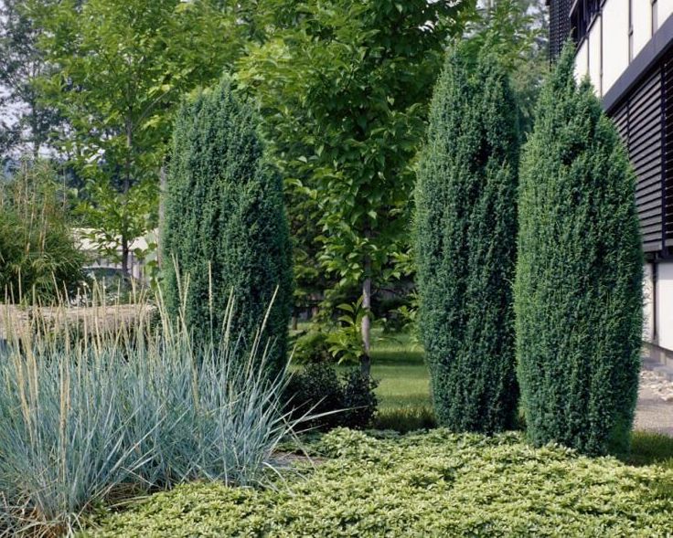Можжевельник Хиберника нередко сажают вдоль дорожек сада, аллей. Эффектно смотрятся рядом с ним: